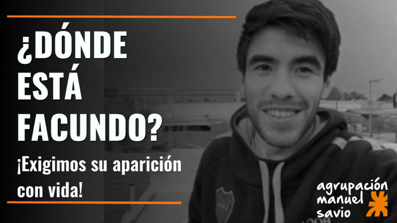 En especial exigimos la aparición con vida de Facundo Astudillo, quien está desaparecido desde el 30 de abril, día en el que fue visto por última vez esposado junto a un patrullero de la Policía Bonaerense. En la causa se ha apartado a personal policial por las denuncias que la madre de Facundo ha realizado sobre las amenazas que recibió por parte de un subcomisario de la bonaerense.