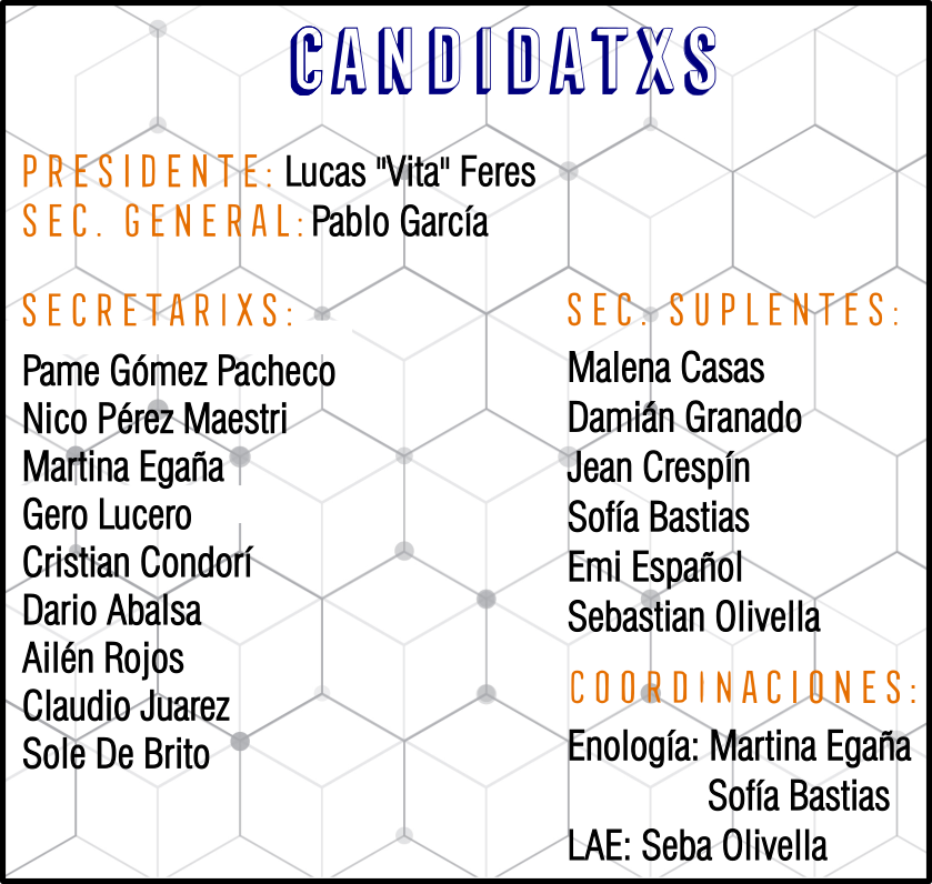 BALANCE 2019 PROPUESTAS 2020 EDITORIAL Este año arrancó con un claro mensaje de que no iba a ser fácil: el 2 de enero aumentó el transporte 63%. La inflación hoy supera el 50% anual, cierran PyMEs todos los días y recién en septiembre, después de los resultados de las PASO, la beca Progresar tuvo un aumento del 40%. Como estudiantes, ¿podemos estar ajenos a la realidad en la que vivimos, la que viven nuestrxs compañerxs y amigxs?. Estamos convencidxs de que no se puede estar ajeno a esta realidad. La historia nos ha enseñado que de este tipo de sucesos se sale con solidaridad, empatía y trabajo colectivo. El aumento de transporte, la comida, el material de estudio, las fotocopias, como también la incertidumbre de poder desarrollar nuestra profesión en nuestro país nos afectan directamente como estudiantes, dificulta el acceso y hasta la permanencia en la facultad. Es por eso, que garantizar abierto el Centro de Estudiantes todos los días, obtener más becas de transporte, aumentar acorde a la inflación los montos de las becas del Centro de Copiado Autogestionado , el haber organizado el “Kit contra la inflación” son algunas medidas que nos parecen fundamentales para combatir la crisis. Como estudiantes universitarios es importante apropiarnos y democratizar el conocimiento y la tecnología, ya que estas son herramientas fundamentales que nos permiten generar alternativas para la autodeterminación del país que queremos, nos ayudan a estar integradxs en la sociedad que vivimos, poder ser críticxs de la realidad que transitamos y también transformarla. La extensión universitaria es una de las formas en las que podemos concretar estas acciones, mirando al que tenemos a nuestro lado y poniendo el conocimiento a disposición de la sociedad para fortalecer la democracia con el objetivo de un país más justo. Obviamente, esto sólo no es la solución a nuestros problemas. Debemos pensar y repensar cómo llegamos hasta acá, por qué, cuáles son nuestras limitaciones y hacer una profunda crítica a la política argentina que no ha podido garantizar las necesidades básicas. Ya no toleramos la falta de respuesta porque las consecuencias son devastadoras. ¿Cuántos problemas actuales son el resultado de repetir políticas que sabemos que no funcionan, pero no nos animamos a cambiar? No repitamos recetas porque en algún lugar y en algún momento funcionaron, analicemos nuestra realidad local de hoy, discutamos todo, lleguemos a consensos y actuemos. Para esto la política debe estar basada en evidencias, ser transparente, organizada, con participación y que tenga como fin el bien común y no la mezquindad de unos pocos, porque cuando peleamos por separado nos ganan a todxs juntos. Independientemente del gobierno de turno, entre todxs seguiremos mejorando y defendiendo la educación pública, haciéndole frente a la deserción estudiantil, presentando nuevos proyectos que mejoren el acceso, el seguimiento académico y la calidad de enseñanza. Todo esto no podemos hacerlo sin tu ayuda, ya que la Universidad que queremos sólo podemos construirla colectivamente CANDIDATXSDefensa gremial