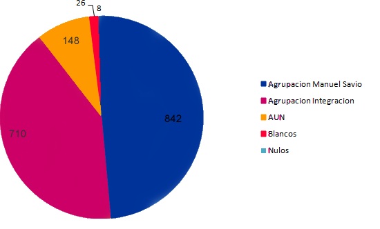 | Agrupación Manuel Savio: 842 Agrupación Integración: 710 AUN: 148 Blancos: 26 Nulos: 3 |